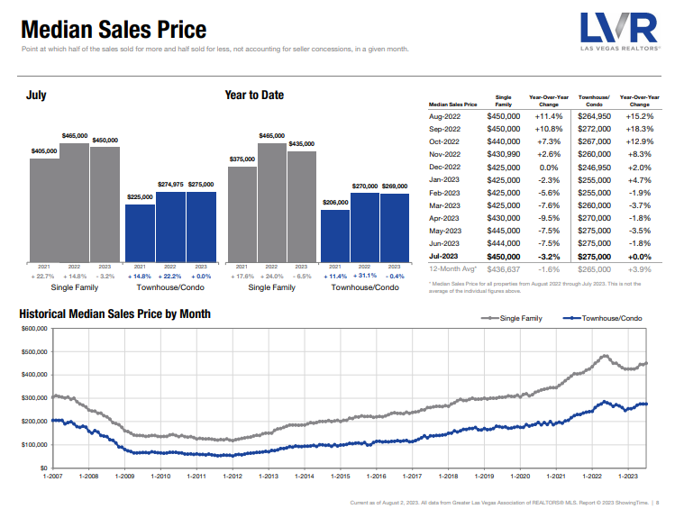 The median price for a single family home in the Las Vegas Valley went up $6,000 in July, going from $444,000 the previous month to $450,000. This matches the first time since last July that the median price has been the same or higher year over year, after experiencing a small price decrease from August 2022 to December 2022. The average sales price is also up year over year, from $549,950 last month to $569,962 in July 2023 (a 4.6% increase from last year).